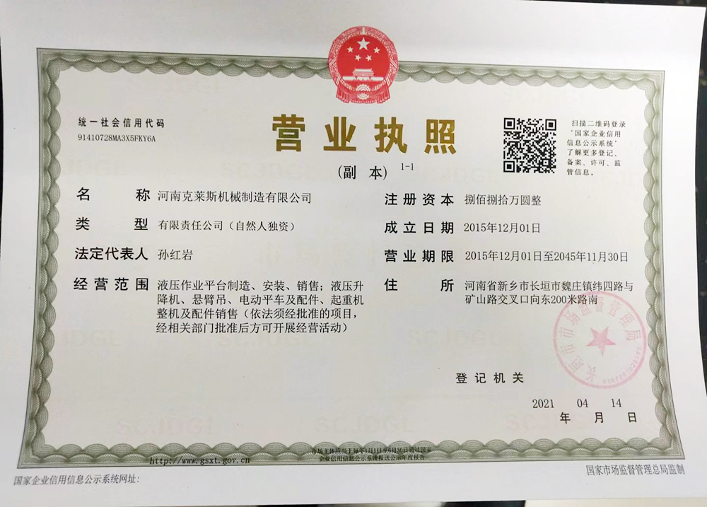 河南克萊斯機械制造有限公司位于河南省長垣市魏莊工業(yè)園區(qū),公司注冊資金捌佰捌拾萬元整,在職員工40余名,擁有研發(fā)設(shè)計團隊,是一家生產(chǎn)液壓升降作業(yè)平臺及旋臂起重機生產(chǎn)銷售的廠家。  公司主要產(chǎn)品有:固定導(dǎo)軌式液壓升降作業(yè)平臺、移動式液壓升降平臺、車載式液壓升降平臺;定柱式懸臂吊、墻壁吊、電動平車、登車橋等。  精良的設(shè)備,嚴格的管理是公司得以不斷發(fā)展壯大、產(chǎn)品能夠贏得用戶依賴的根本所在。  “精確、...... <了解更多>